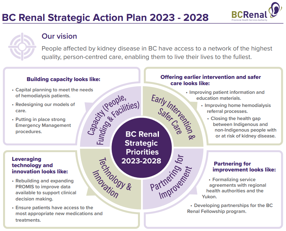 BC Renal’s 2023-2028 strategic action plan was developed in consultation with key partners, including patients and families. This consultation surfaced the need to focus BC Renal’s work on the four strategic priorities: